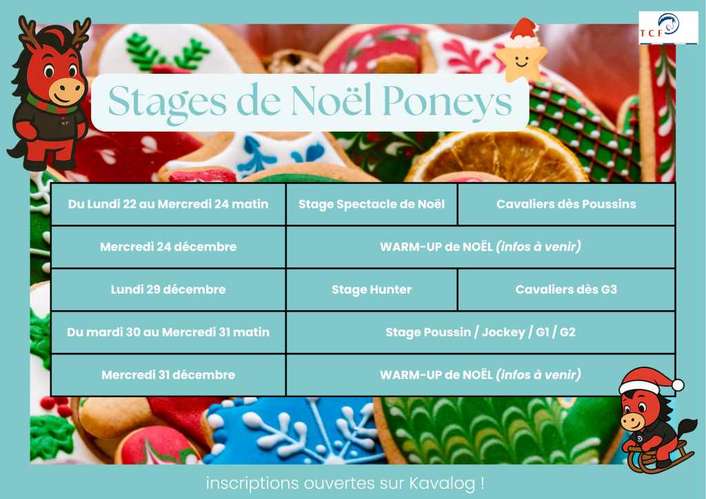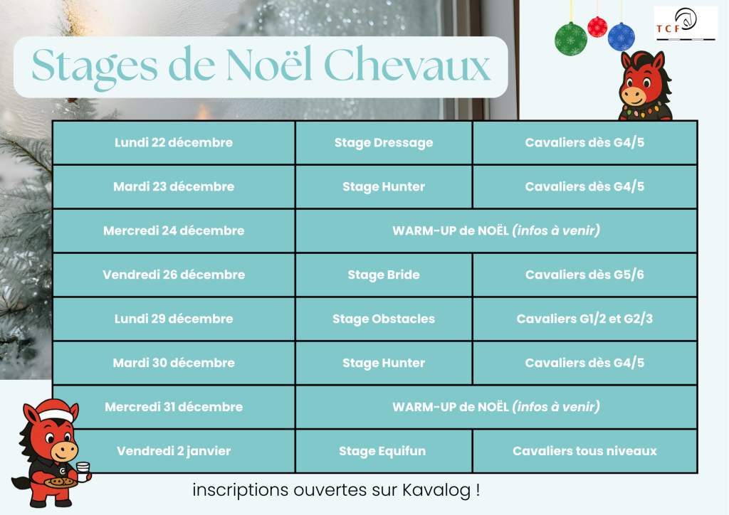 Durant les deux semaines de vacances, le Touring vous propose de faire le plein d’activité : Hunter, Dressage, Jeux à poney, Equifun, Monter un spectacle de Noël, etc.