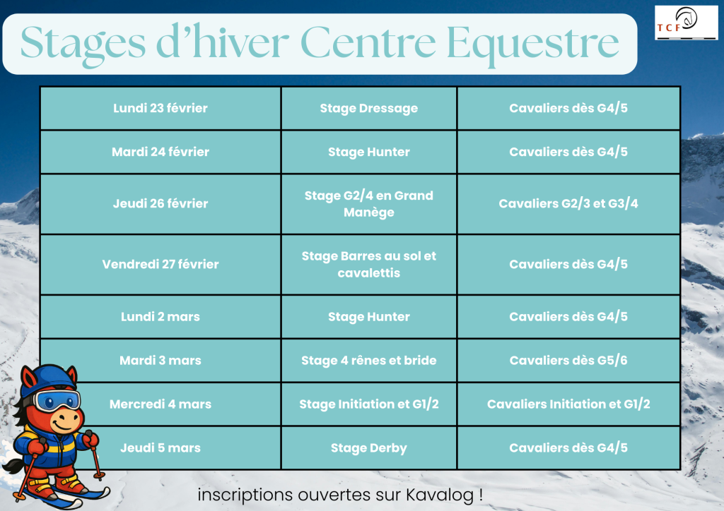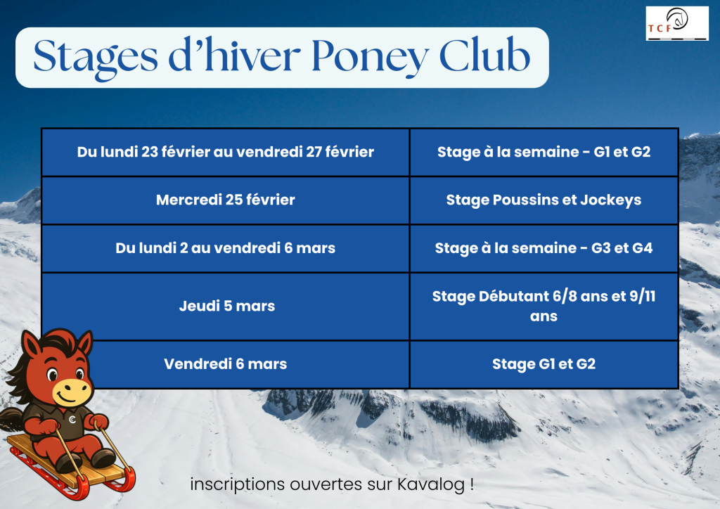Nous vous rappelons que les cours du Poney Club, ainsi que quelques cours du Centre Equestre, (entre 10h et 12h et entre 14h et 16h en semaine) sont annulés durant les vacances. Des bons de récupération vous sont automatiquement attribués,utilisables dans les 2 mois.