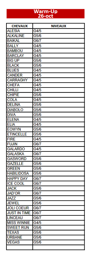 Les Warm-up sont des séances de travail libre d’une heure avec le cheval de votre choix. Ces séances se déroulent sous la surveillance d’un enseignant, mais il ne s’agit pas d’un cours : à vous de gérer votre travail en autonomie !